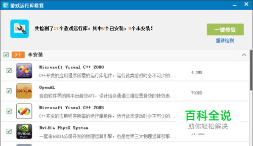 我们要确认一下是否下载了该游戏需要的运行库,否则可能会打不开NSUNSR_launcher.exe,点击全选,修复全部的运行库。