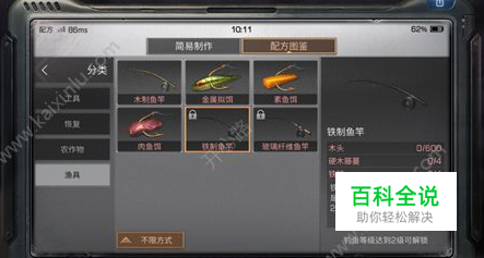 [鱼竿制作方法] 主界面左下角的的[配方]一[配方图鉴]一[生存]中可以看到鱼竿和鱼饵的制作方式。[从低到高等级的鱼竿制作材料方法浏览]。