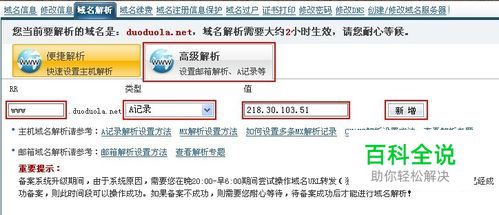 主机域名A记录解析:点击“高级解析”,选择类型为“A记录”并填写“RR”值和指向的IP地址“值”,点击“新增”,如下图(下图中的218.30.103.51只是让您参考,您在设置解析时“值”里面填写的应是您主机的IP地址,如果您的主机不是万网购买的,请联系主机提供商查询):