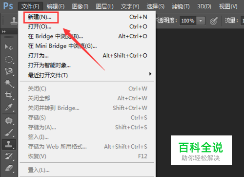 打开ps之后在菜单里找到文件选项,点击该选项在其子级菜单里找到新建选项,如图所示: