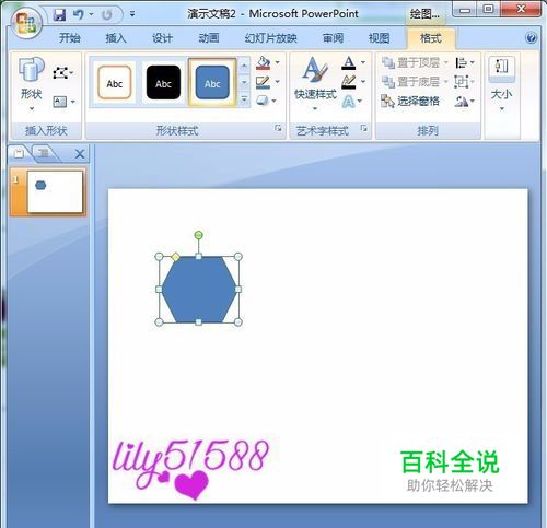 打开PPT软件,新建一个空白文档。 【插入】一个图形,【基本形状】——【六边形】。