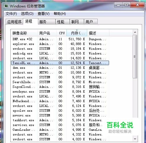 3.具体操作(不能关闭的) 关闭进程,是指的关闭和DNF相关的进程,但是这些进程的手动关闭,还不能影响游戏的正常运行.所以我先展示一下不能关闭的进程名字.如图是DNF游戏的主程序关了的话,相当退出游戏....一定不能关闭.