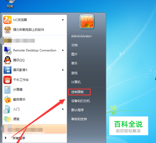 首先我们点击电脑坐下角的开始图标,在弹出的选项里,我们点击“控制面板” 如图