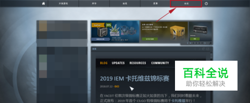 先打开csgo,进入游戏界面后,点击右上角的 选项进入 视频设置页面。