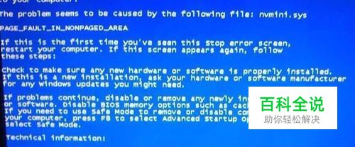 停止代码:0x00000050 说明文字:PAGE-FAULT-IN-NONPAGED-AREA 通常的原因:内存错误(数据不能使用分页文件交换到磁盘中)。 解决方法:电脑重启进安全模式,卸掉所有的新近安装的硬件。运行由计算机制造商提供的所有系统诊断软件,尤其是内存检查。