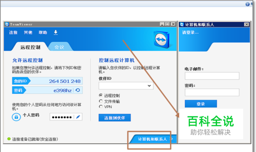 右则滑出计算机和联系人账户登陆界面,在没有注册TeamViewer账号前,点击注册,进行新用户注册。