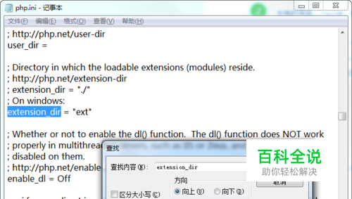 继续查找“extension_dir”,注意搜索方向改为“向上”,找到如下行: ; On windows: ; extension_dir = "ext" 将extension_dir = "ext"前面的分号去掉。