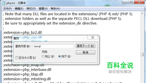 文件打开后,Ctrl+F,弹出查找对话框,输入"mysql",点击“查找下一个”,如下图,定位到以下行: extension=php_mysql.dll extension=php_mysqli.dll 如果你的ini文件未做过修改,每行前的开头会有一个分号,将其删除。