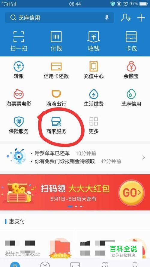 打开支付宝,找到“商家服务”,点击一下。如图: