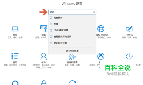 打开“Windows设置”,进入驱动页面。 ①点击电脑左下角的“开始”→齿轮形状的图标“设置”→打开“Windows设置”界面; ②在搜索框中输入“驱动”,回车键Enter进入驱动程序页面。