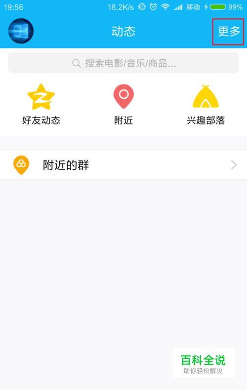 首先,请大家打开手机QQ应用,在手机QQ应用主页面中点击选择“ 动态”选项页面卡,在动态页面中点击页面右上角的“ 更多”按钮。