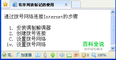 例 有序列表标记的使用 <HTML> <HEAD> <TITLE>有序列表标记的使用</TITLE> </HEAD> <BODY> 通过拨号网络连接Internet的步骤 <OL> <LI>安装调制解调器 <LI>创建拨号连接 <LI type="A">设置拨号网络 <LI type="i">设置拨号网络 </OL> </BODY> </HTML>