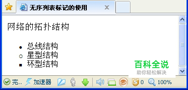 例 无序列表标记的使用 <HTML> <HEAD> <TITLE>无序列表标记的使用</TITLE> </HEAD> <BODY> <FONT size=4>网络的拓扑结构</FONT> <UL> <LI>总线结构 <LI type="circle">星型结构 <LI type="square">环型结构 </UL> </BODY> </HTML>