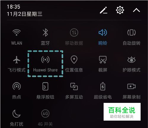 在小伙伴的手机上,从状态栏处向下滑动,打开通知面板。然后点击【Huawei Share > 允许】。