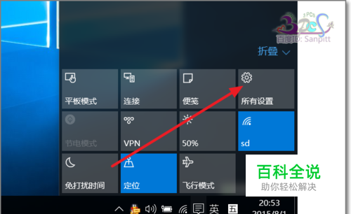 如图,点击打开操作中心。选择所有设置