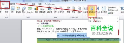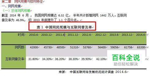 在下图所示的文档中,中国网民规模与互联网普及率这个表格很有可能在撰写其他文档时会再次用到,所以这里我们将它以表格部件的形式保存起来;