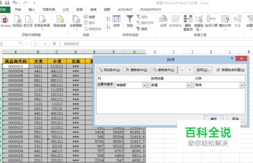用EXCEL打开销售数据表(如图1所示)。 按照销售额,对数据表全选(将鼠标点击第一个数据单元格A3,按住“ctrl+shift“,按下右箭头,再按下箭头,就可以全选整个表格), 进行“降序”排序(如图2)。