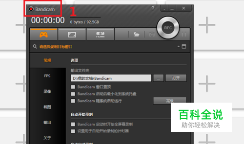 首先,我们打开一个bandicam软件(红框1),此时还没有开始录制,是不会出现问题的。