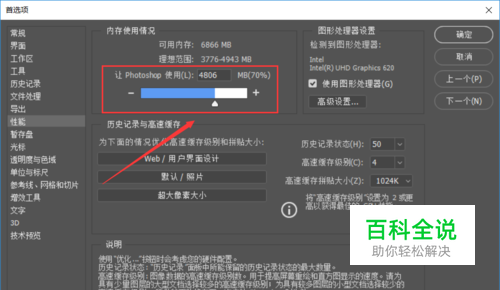 在性能的界面中,将可占内存的比例调到百分之八十左右。