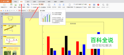 首先我们打开运行PPT,点击“插入”菜单内的“图标”子菜单,如图所示我们完成了系统默认柱形图的插入。