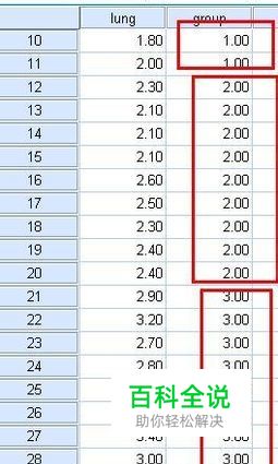 我拿到数据以后,先要在spss中组织数据,如图所示,第一列变量是我们要检验是否为正态的变量,第二列是数据的分组,即他们的组号。有的时候你的数据没有分组,也就是只有一个组,那就没有必要写group列了