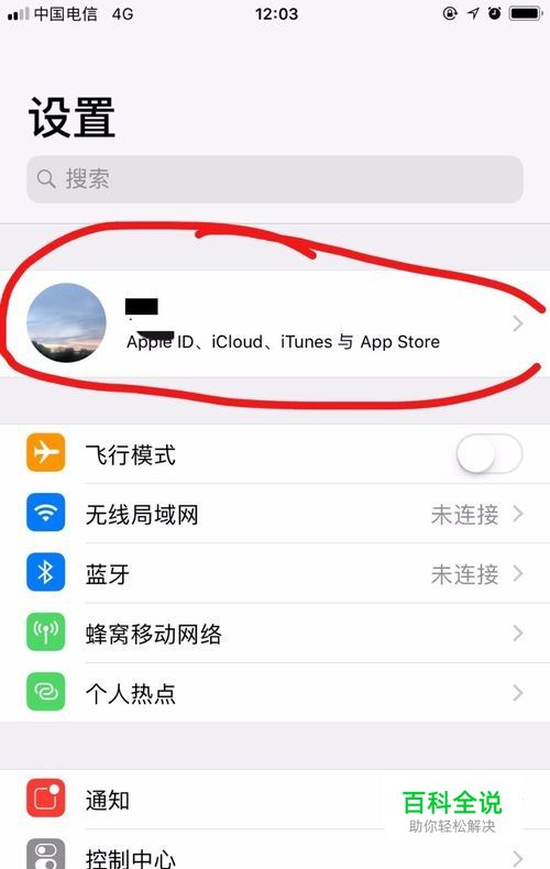 点击“设置”进入到设置界面,在设置功能列表中可以看到头像账号以及“AppleID、iCloud”功能项。如图