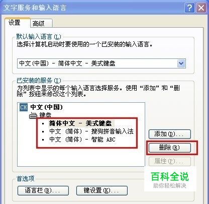 我们可以看到系统默认的输入法为简体中文版,而已安装输入法中有三种,一般只需要保留一种就可以了,我们选中输入法然后点击删除就可以删除多余的输入法了。