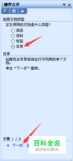 这步很重要,如果是信函,则每个都会在每页中分别显示 如果是目录的话,就会在同一页显示 所以,选择目录 →下一步