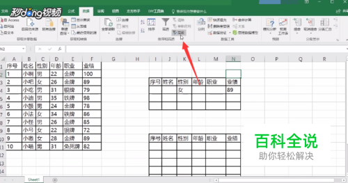 输入好样表后,以筛选条件姓名女、业绩89为例说明,左键双击k4单元格,输入女,然后点击n4单元格,输入89。