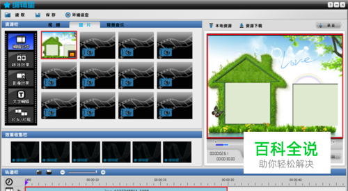 在编辑星画中画中漂亮的背景图片很重要,用户可以通过编辑星软件自己制作出有创意的背景图片。用户可以在图片上加上影像效果,也可以加上文字。 下面我做一个例子,首先我在素材库中找出一张房子的图片导入到编辑星软件中。做为背景图片,图片播放时间是根据自己的需要设定的,当然长了没关系,可以截嘛!短了就麻烦了,所以我在环境设定中把背景图片的播放时间调成了30秒,用户可以根据自己的需要进行调整。