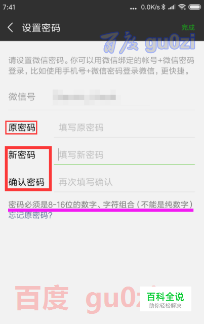 如果没有设置过密码的话,直接输入两次一样的密码,就可以了,已经设置过的朋友,要修改微信密码则需要输入之前的密码才行,这里特别要提到的是密码是有要求的。