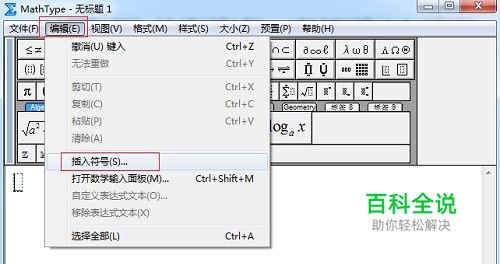 2.在MathType公式编辑界面中进行相应的编辑,然后用鼠标点击MathType菜单中的“编辑”——“插入符号”命令。
