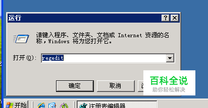 单击左下角【开始】——【运行】,然后在输入框输入 regedit,点击确定,打开注册表。