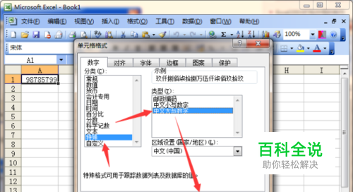 5、在单元格格式对话框中的“数字”选项卡的“分类”框中选择“特殊”选项。在特殊的类型框中选择“中文大写数字”,然后点击“确定”按钮。如图所示;