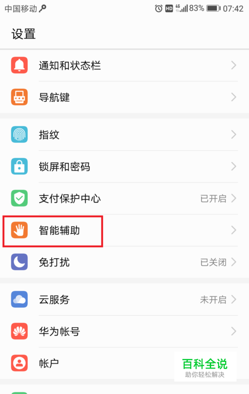 在【设置】界面中找到【智能辅助】菜单,并单击进入【智能辅助】界面。