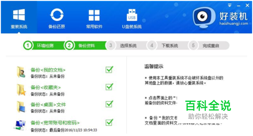 3、进入资料备份界面,通过勾选可以选择对“我的文档”、“收藏夹”、“桌面文件”进行备份。点击“备份资料进入下一步”;