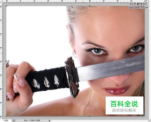 创建一个文档 首先我们找到一个拿剑的女孩的照片,放到新文档中调整大小如下。