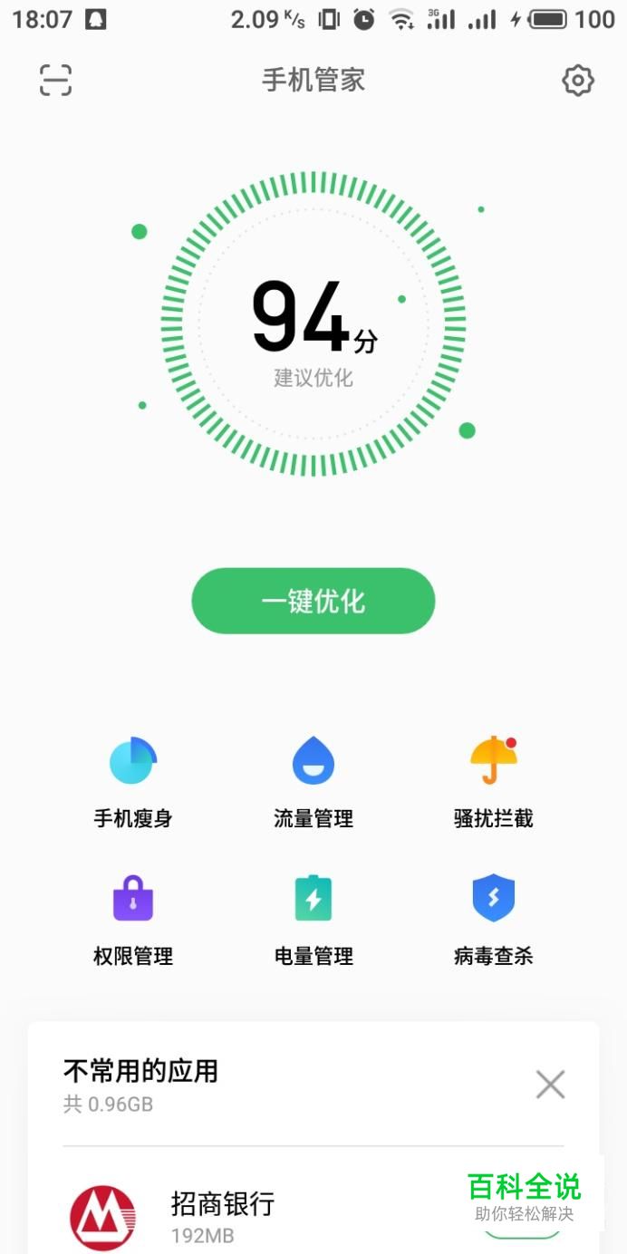 进入系统自带的手机管家界面,在选项中点击“一键优化”