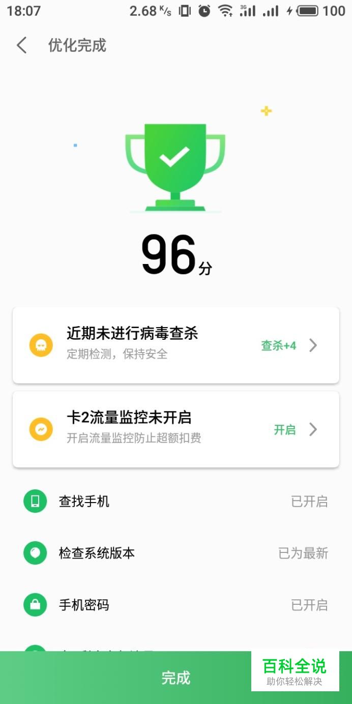 进入一键优化界面后系统会自动完成初级的清理,点击“完成”