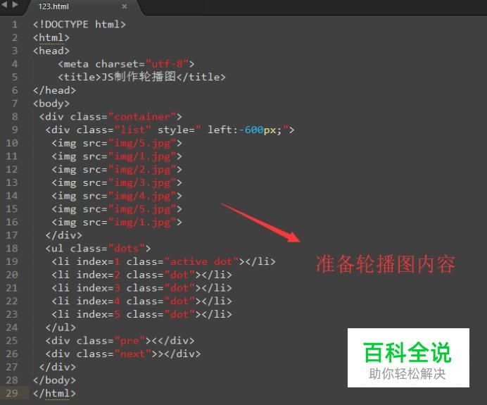 首先需要在Sublime中创建HTML文档,然后在文档的body区域中加入如下图所示的轮播图内容