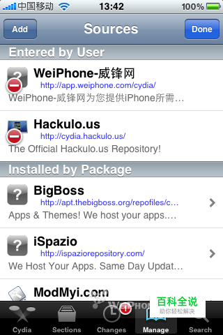 最后一步就是,进入dfu,程序会自己搞定。再次重启进系统,cydia已经可以运行了。注意,你每次需要重启设备时,都要进行一遍该教程的最后一步。越狱到此已经成功一大半,我们再在线安装ip进入cydia画面hone同步cydia补丁,即可大功告成。 1.进入cydia画面 2.等待进入主界面之后,首先需要安装的是这个东西:AFC2ADD 可以按屏幕右下角search搜索 图如下 ,搜到之后点屏幕右上角Install安装 安装完成之后再下一步, 3.继续来操作:最关键的一步,添加cydia源,步骤如下图运行cydia点界面下方的manage,再点sources 4.点击右上角的Edit 5.再点左上角add,在弹出的窗口中输入如下网址:cydia.hackulo.us,输入完毕之后点add source 6.等待片刻之后添加成功,点右上角done 7.点hackulo.us进入这里,找到appsync for os 3.1,进入点右上角的Install,再点confirm,之后就开始安装了 8.等待安装完成之后点屏幕最下方的按钮,手机重启,恭喜你,你已经可以安装论坛里的任何iphone文件了 注意事项 1、此教程适用于4.2.1固件的3GS和iPhone 4,不适用于3G版iPhone,iPhone 3G 2、以下教程也不适用于4.2.1 之前的固件的iPhone,比如4.1固件,如果你的设备正运行着4.1固件,你可以通过两种方式来越狱,点击查看[方法一:绿雨] [方法二:绿毒] ;其他固件用户请点击越狱破解专题查看详细教程(请在设备上检查 设置->通用->关于本机 中检查设备运行的固件版本) 3、如果你想要升级固件到4.2.1后再越狱,请通过 iTunes 更新你的固件后再越狱; 4、有锁的用户升级固件的时候要慎重,iOS4.2.1固件有升级基带暂时还无法解锁,请有锁的用户不要 升级到4.2.另外新手还需要了解下iPhone的两个主要按键,避免混淆。1固件,否则您iPhone的电话功能将无法使用,如果你一定要升级到4.2.1固件,请使用 TinyUmbrella 来防止基带升级。 5、在越狱前,以防万一,你需要备份下iPhone,另外要保存下shsh文件。详细教程请点击《使用TinyUmbrella 备份SHSH》