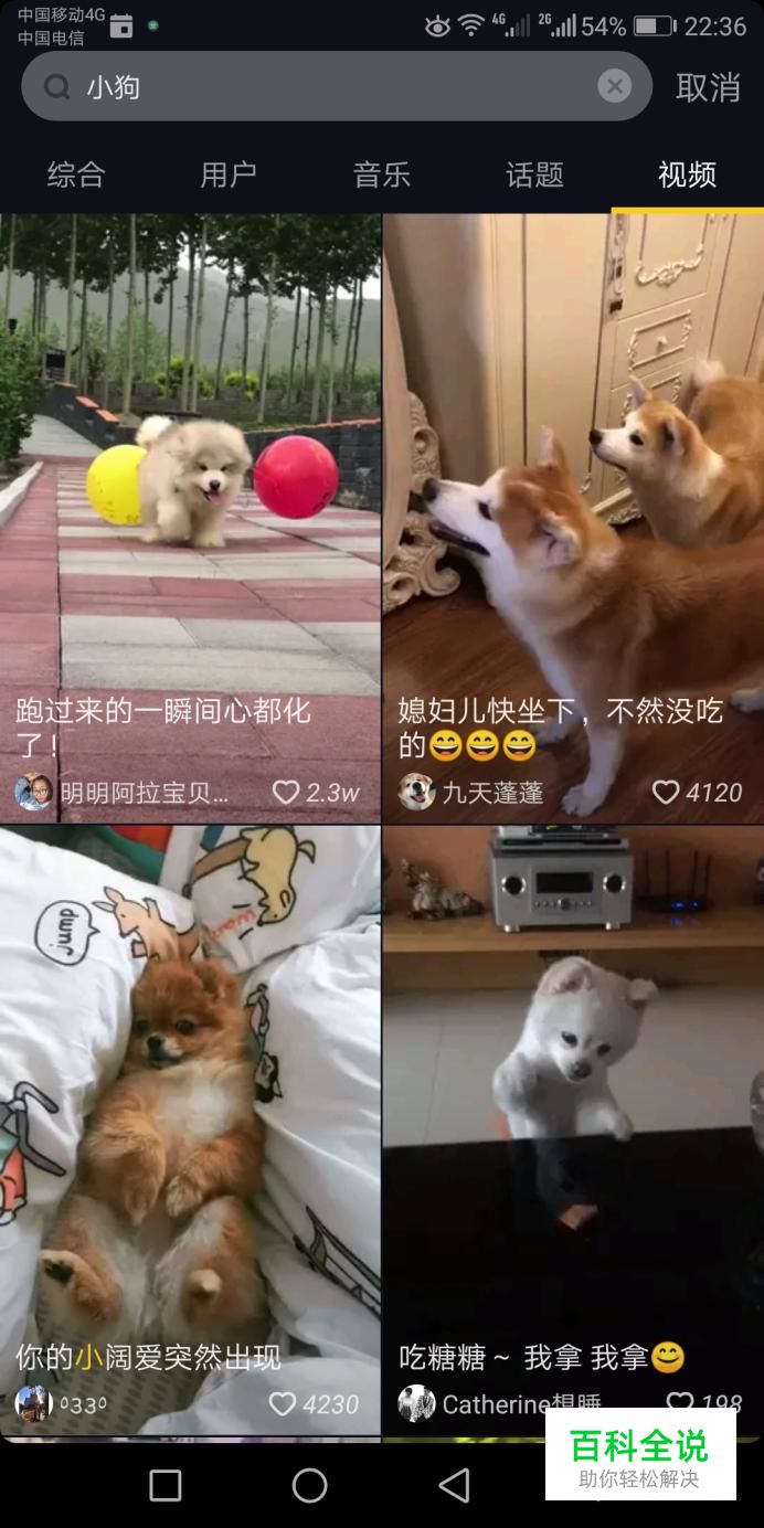 打开抖音视频,允许弹出来的所有权限要求。在抖音列表搜索小狗