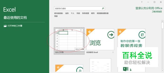 启动Excel 2016电子表格应用程序,如图所示点击界面右侧新建空白工作簿。