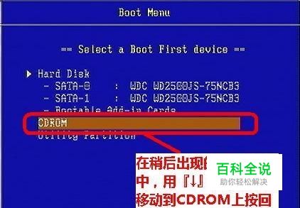 2、出现启动设备选择菜单后,把您可引导的光盘放入光驱,稍等一会,然后选择CDROM这项,按回车即可尝试从光驱启动