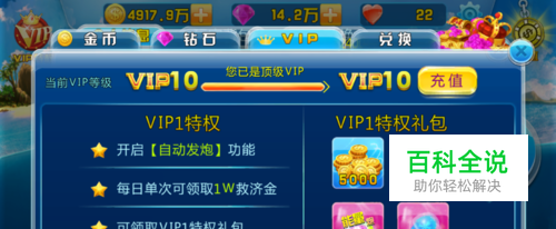 VIP1 1、开启【自动发炮】功能 2、每日单次可领取1w救济金 3、可领取VIP1特权礼包 VIP1特权礼包内容: 金币X 5000;道具【锁定】X 2;道具【能量炮】X5;道具【定屏炸弹】X 2。