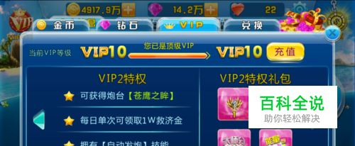 VIP2 1、可获得炮台【苍鹰之眸】 2、每日单次可领取1W救济金 3、拥有【自动发炮】技能 VIP2特权礼包内容: 苍鹰之眸炮台;金币X 20000;大师分X 2000;道具【能量炮】X5。