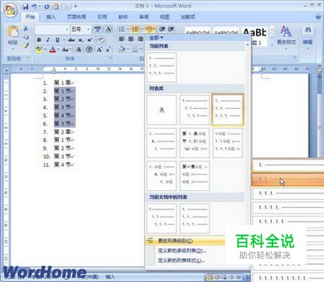 第1步,打开Word2007文档窗口,在“开始”功能区的“段落”分组中单击“多级列表”按钮。在打开的多级列表面板中选择多级列表的格式。