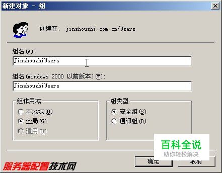 第2步,打开“新建对象-组”对话框,在“组名”编辑框中输入所创建的组的名称(如JinshouzhiUsers)。然后在“组作用域”区域选中“全局”单选框,并在“组类型”区域选中“安全组”单选框。最后单击“确定”按钮即可,如图2008112521所示。 图2008112521 “新建对象-组”对话框 小提示:组可以分为“安全组”和“通讯组”两种类型,针对每种类型的组又可以赋予其不同的作用范围,即“本地域”、“全局”和“通用”。