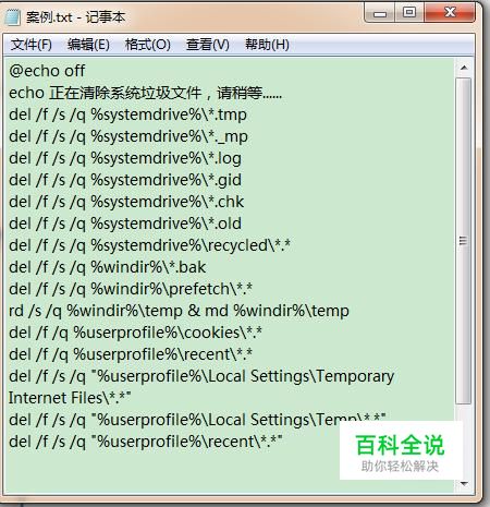 然后在记事本中输入@echo off echo 正在清除系统垃圾文件,请稍等...... del /f /s /q %systemdrive%\*.tmp del /f /s /q %systemdrive%\*._mp del /f /s /q %systemdrive%\*.log del /f /s /q %systemdrive%\*.gid del /f /s /q %systemdrive%\*.chk del /f /s /q %systemdrive%\*.old del /f /s /q %systemdrive%\recycled\*.* del /f /s /q %windir%\*.bak del /f /s /q %windir%\prefetch\*.* rd /s /q %windir%\temp & md %windir%\temp del /f /q %userprofile%\cookies\*.* del /f /q %userprofile%\recent\*.* del /f /s /q "%userprofile%\Local Settings\Temporary Internet Files\*.*" del /f /s /q "%userprofile%\Local Settings\Temp\*.*" del /f /s /q "%userprofile%\recent\*.*" echo 清除系统LJ完成! echo. & pause
