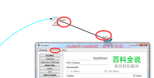 搭建拓扑结构,如图1所示Router0与switch0之间的线路无法联通,双击Router0---config--FastEthernet0/0--勾选ON,打开FastEthernet0/0的端口,1-2秒网络慢慢联通。